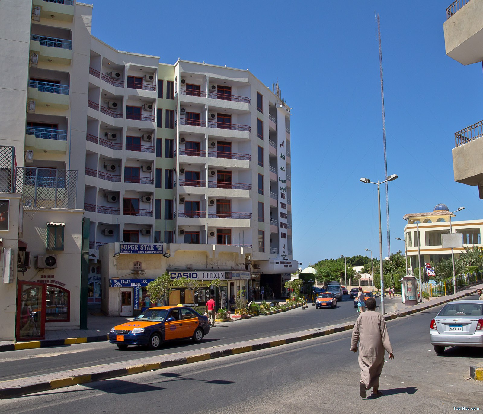 Далее следуя указателям, мы нашли свой автобус, встретили представителя "Пегаса", сели и поехали! Впереди была 30 минутная дорога до отеля. Все это время скучно не было, наоборот интерес только возрастал. Всю дорогу мы разговаривали с местным гидом, он очень хорошо говорил по русски. Он нам рассказал о местных обычаях и правилах, например мы узнали что по Египетским законам запрещается купаться в море а так же в бассейнах после 18 часов, как он нам сказал, объясняется это тем что в Красном-Море очень много разной живности, и в тёмное время суток они могут нас покалечить, а мы их. Ну хорошо, с морем понятно, ну а почему в бассейнах нельзя? Ну ладно, это не столь важно! :) Пока мы ехали я смотрел на город, он очень интересный, и красивый, видел несколько старых интересных автомобилей (признаюсь, это моё увлечение). Вдоль дорог очень много недостроенных зданий, и мы спросили гида, с чем это связано? Ведь недостроев очень много, но нет кранов, и рабочих не видно. На что гид нам ответил, что это связано с финансовым кризисом, после 2008г многие стройки заморожены. Все это было очень интересно! Но мы подъехали к нашему отелю. И вот перед нами "Triton Empire Hotel"! :)